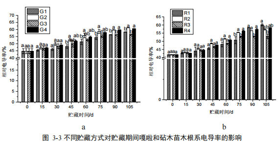 由圖3-3(a)可知貯藏期間四組處理嘎啦苗木根系相對(duì)電導(dǎo)率逐漸升高,不同貯藏 時(shí)期四組處理嘎啦苗木相對(duì)電導(dǎo)率呈現(xiàn)顯著性差異。其中貯藏45d和60d時(shí),G2處理嘎啦苗木根系相對(duì)電導(dǎo)率顯著高于G1組處理(p<0.05),貯藏75d后,G2處理苗木根系相對(duì)電導(dǎo)率顯著高于G1和G3處理(p<0.05),到貯藏105d,四組處理苗木相對(duì)電導(dǎo)率率達(dá)到最高分別為58.24%、61.28%、56.35%和60.57%。與圖3-3(a)相同,圖 3-3(b)砧木根系電導(dǎo)率貯藏期間也逐漸升高,不同處理之間存在差異性,其中貯藏75d,G2和G4組處理砧木根系相對(duì)電導(dǎo)率顯著高于其他兩個(gè)相對(duì)電導(dǎo)率(p<0.05),從貯藏90d起,處理G1砧木相對(duì)電導(dǎo)率開始高于其他三組。